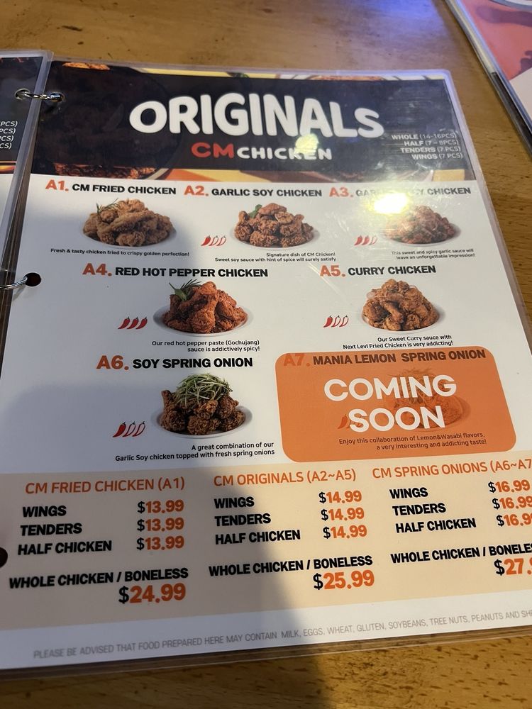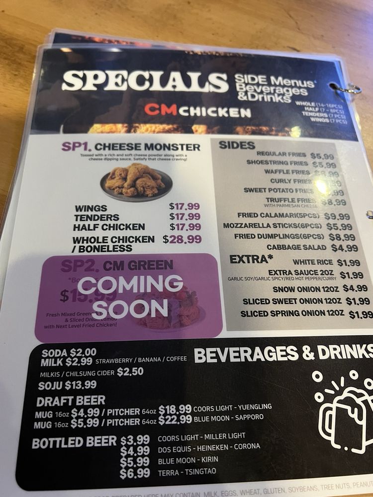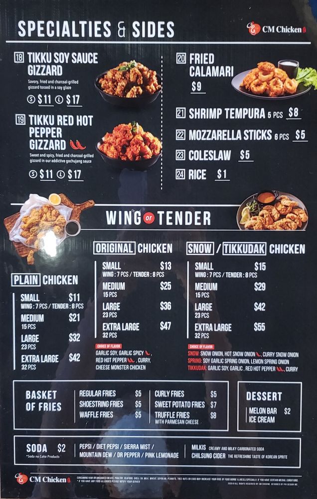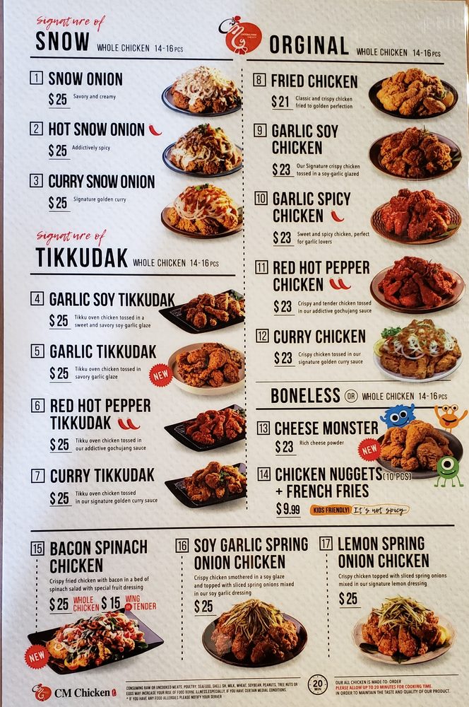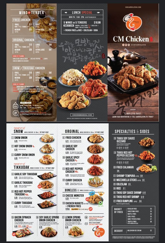 Introducing the menu at CM Chicken Carrollton, a Korean-Asian fusion chicken shop located in Carrollton, TX. This Asian-owned establishment offers a plethora of amenities such as wheelchair accessibility, delivery, and outdoor seating. Their menu boasts unique dishes like Soy Sauce Gizzard, Spring Onion Chicken, and Curry Tikkudak Wings. Customers rave about the crispy and flavorful chicken, with highlights including the smoky and crispy Tikkudak and addictively delicious Spring Onion Chicken. The garlic spicy chicken has a perfect balance of heat and flavor, while the sweet potato fries and waffle fries complement the dishes well. Service is fast, prices are reasonable, and portion sizes are satisfying. For a refreshing take on Korean fried chicken with inventive flavors, CM Chicken Carrollton is a must-try destination.